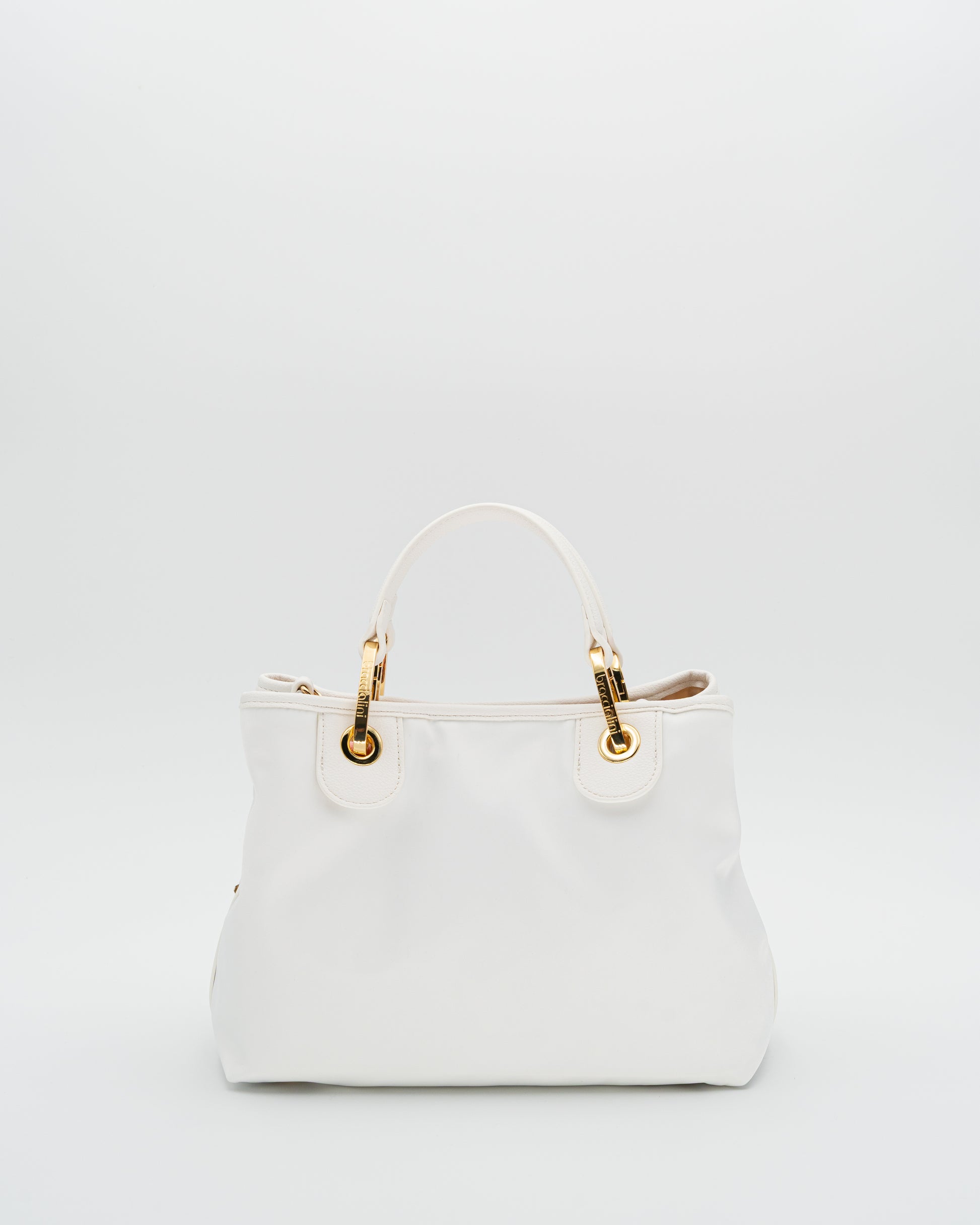 Borsa a mano di medie dimensioni con doppi manici, chiusura con clip e tracolla in nastro logato rimovibile e regolabile che ne permette la doppia portabilità. All'interno una pochette totalmente estraibile e utilizzabile come seconda borsa a cui è possibile agganciare la tracolla a nastro. Il modello è in nylon di colore bianco decorato con applicazioni di strass e borchiette di varia misura tono su tono, che creano un effetto scintillante e sofisticato