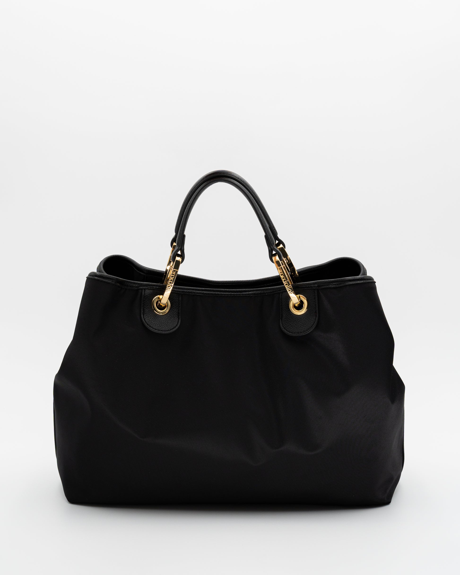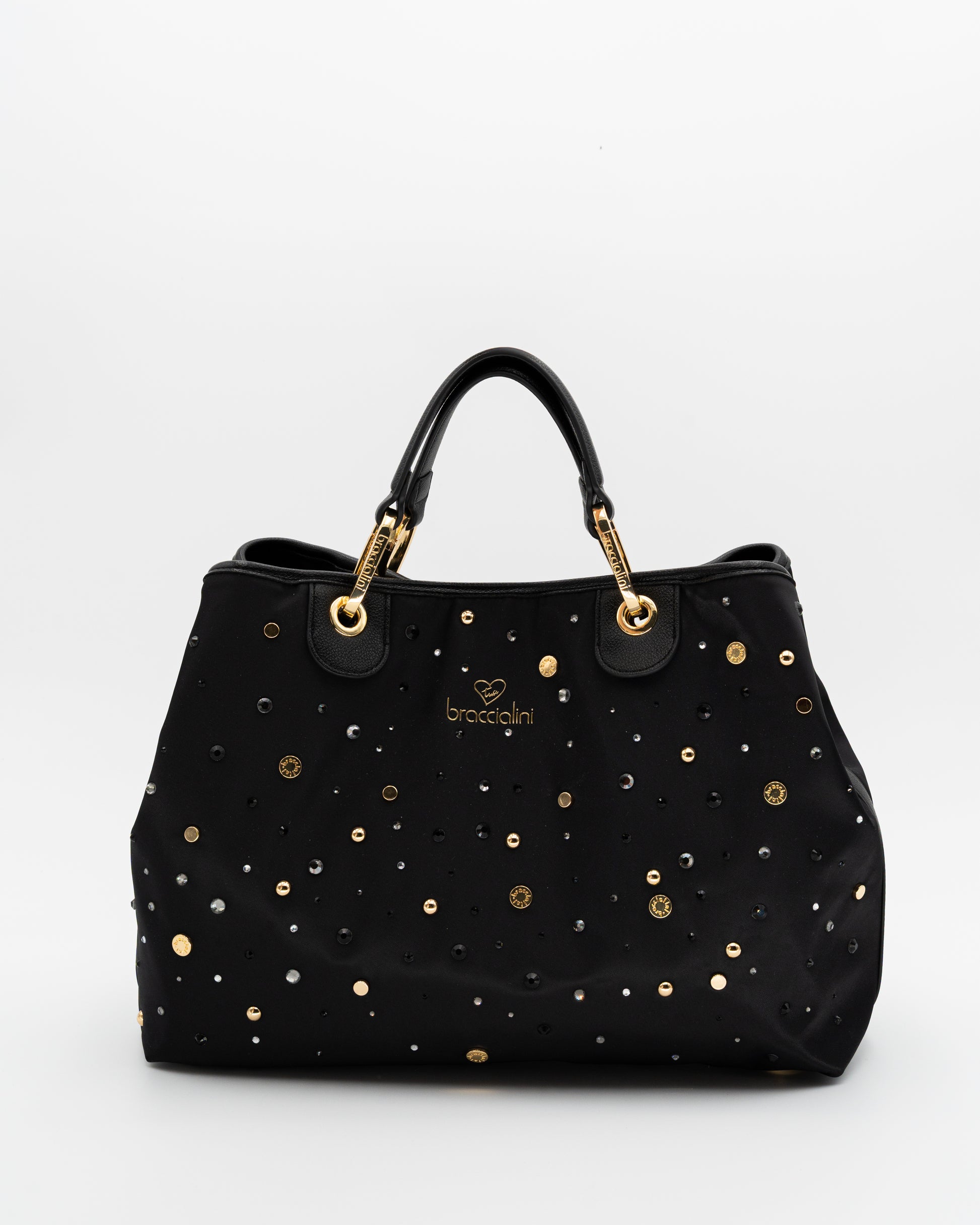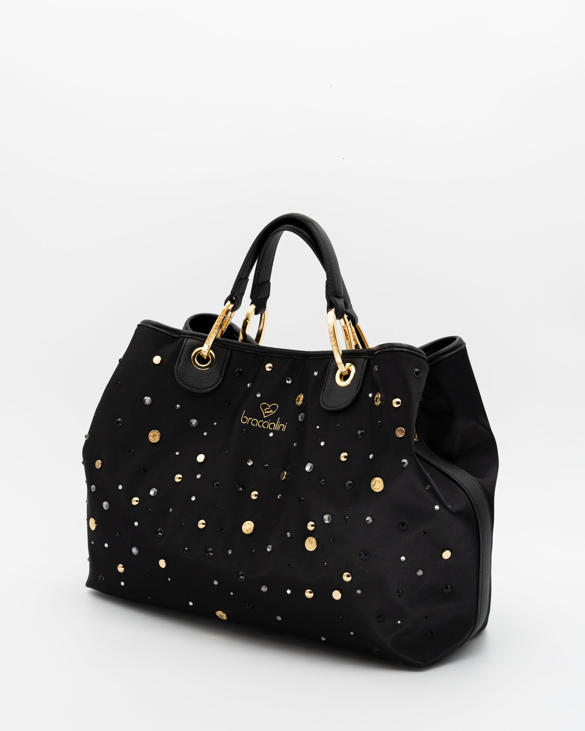 Borsa a mano di grandi dimensioni con doppi manici, chiusura con clip e tracolla in nastro logato rimovibile e regolabile che ne permette la doppia portabilità. All'interno una pochette totalmente estraibile e utilizzabile come seconda borsa a cui è possibile agganciare la tracolla a nastro. Il modello è in nylon di colore nero decorato con applicazioni di strass e borchiette di varia misura tono su tono, che creano un effetto scintillante e sofisticato.