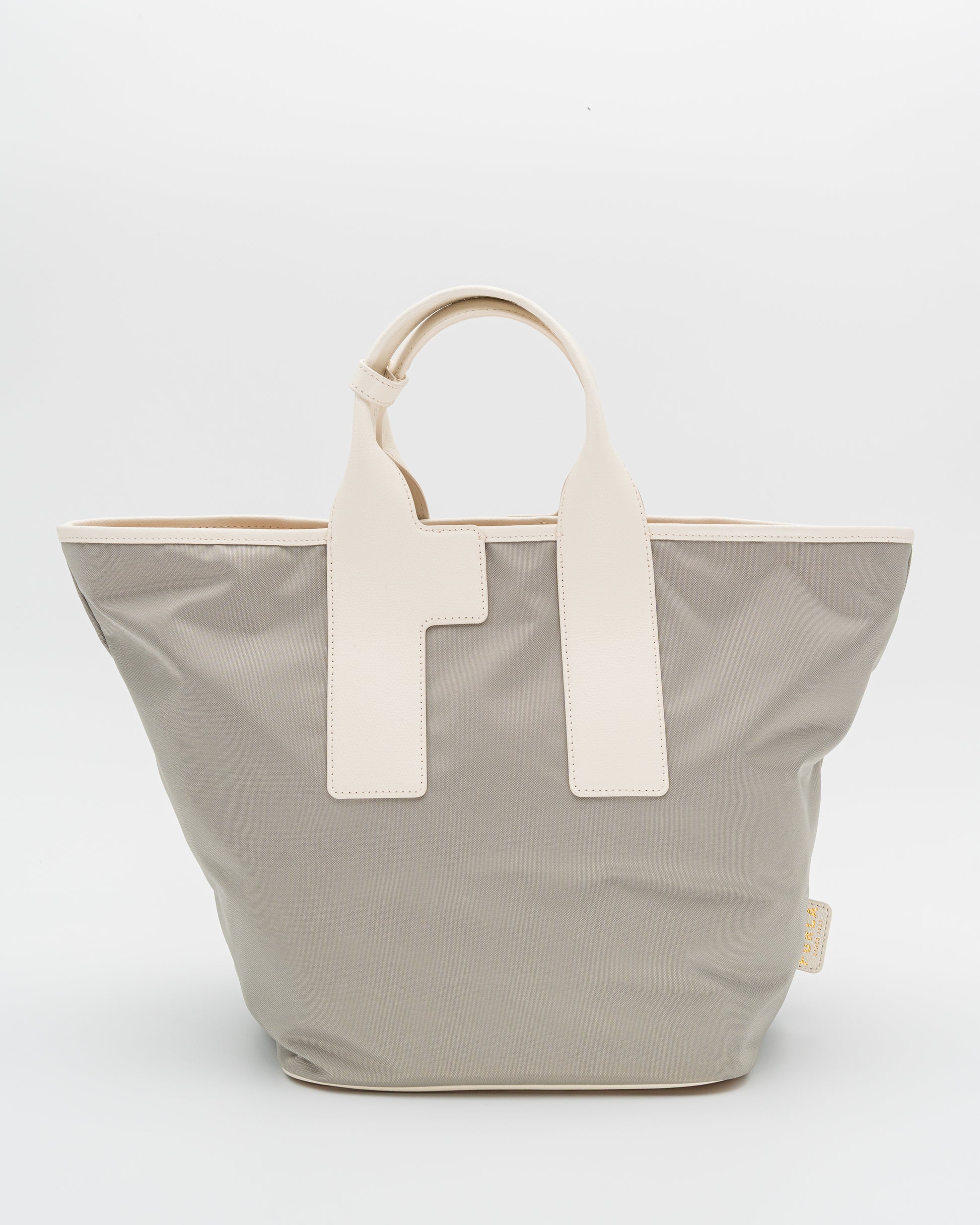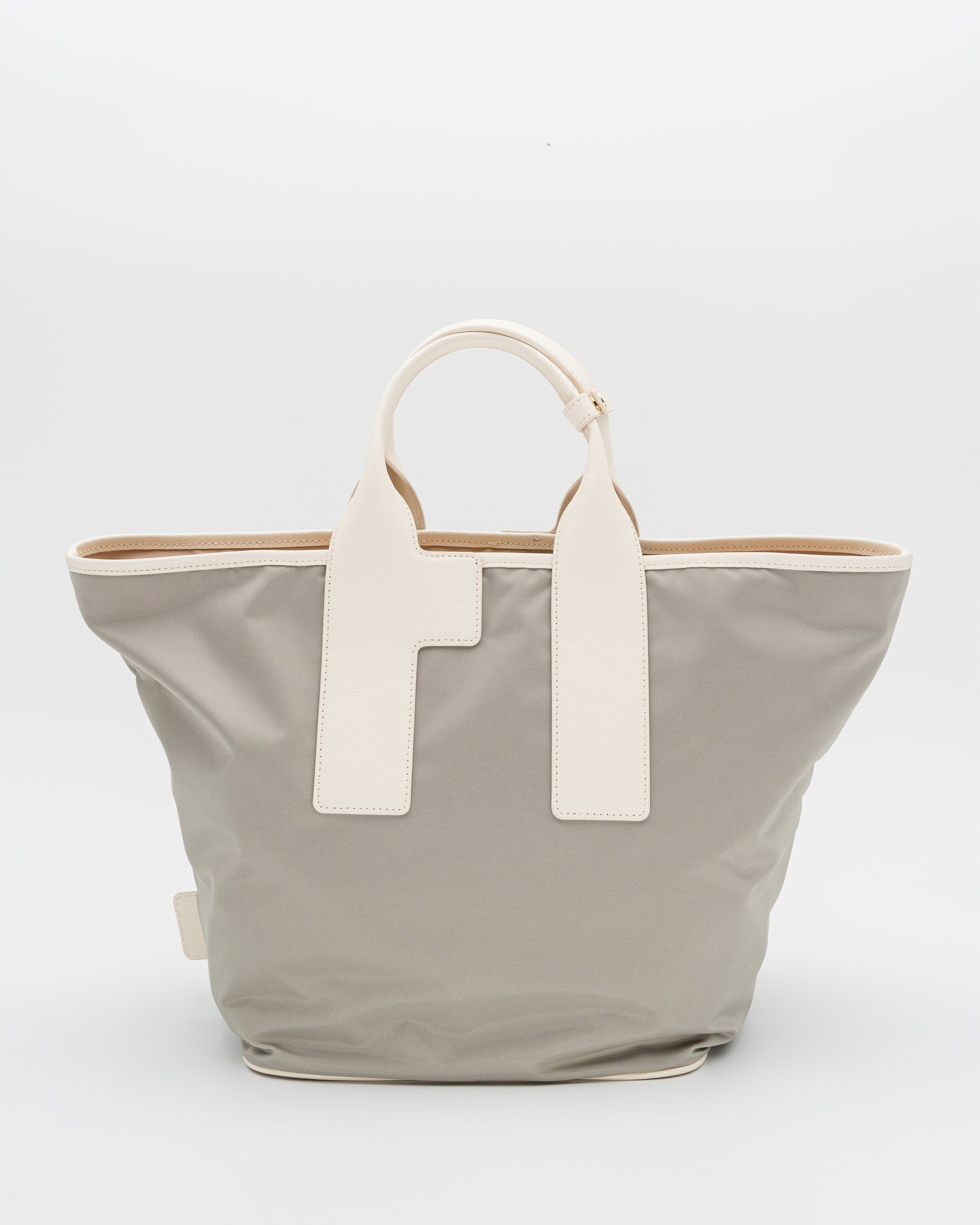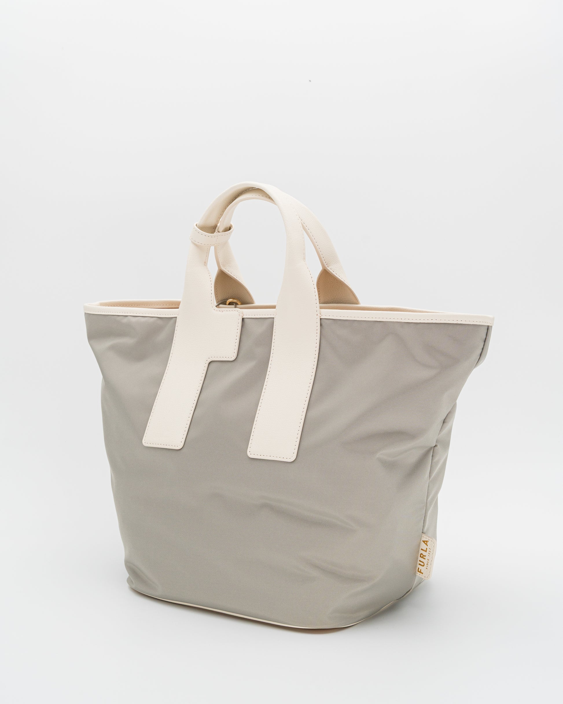 La shopper Piuma di Furla leggera ed ampia, è adatta ad ogni spostamento ed utilizzo. Realizzata in nylon riciclato si caratterizza per i manici in pelle stampata a forma di iconico logo Arco che ricreano un elegante effetto cromatico color-block. Da indossare come pratica borsa a mano in città o come travel bag, è corredata dalla linguetta con bottone a pressione per un facile aggancio al proprio trolley da viaggio.